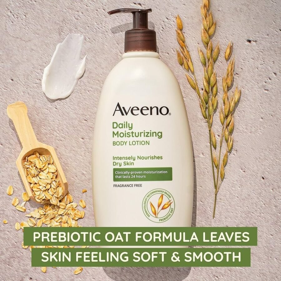 Aveeno Daily Moisturizing Lotion is a dermatologist-recommended, fragrance-free body lotion for dry skin, featuring prebiotic oat and dimethicone to intensely nourish, replenish the skin’s moisture barrier, and provide 24-hour hydration with a fast-absorbing, non-greasy feel, suitable for daily use, even on sensitive skin, leaving skin soft and healthy-looking.