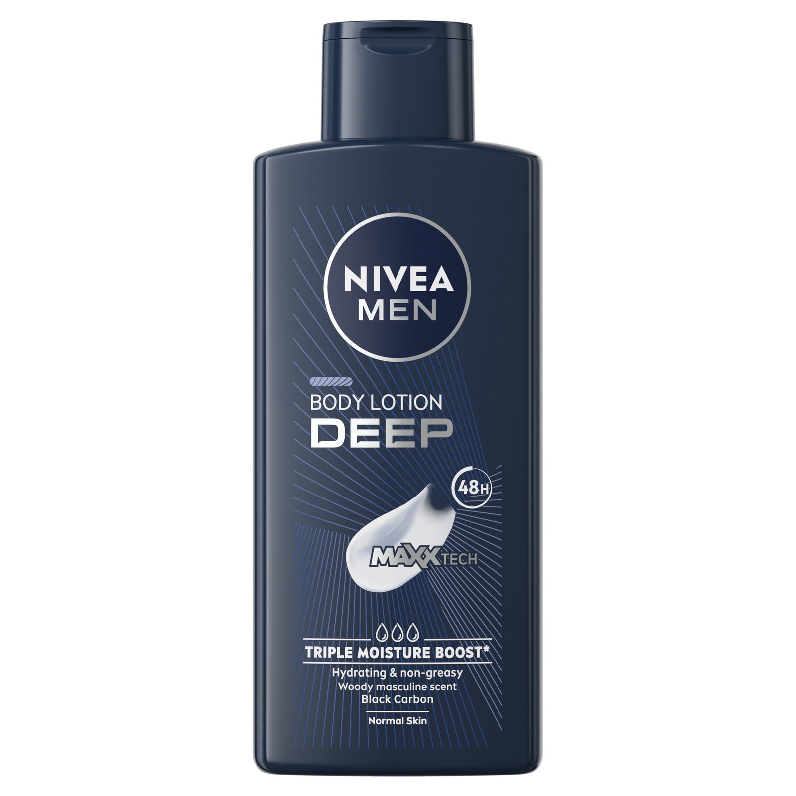 NIVEA Men Deep Impact Body Cream 400ml intensely moisturises skin for 48 hours, and leaves it feeling fresh thanks to black carbon. Woody and spicy notes give skin a distinctly masculine scent.