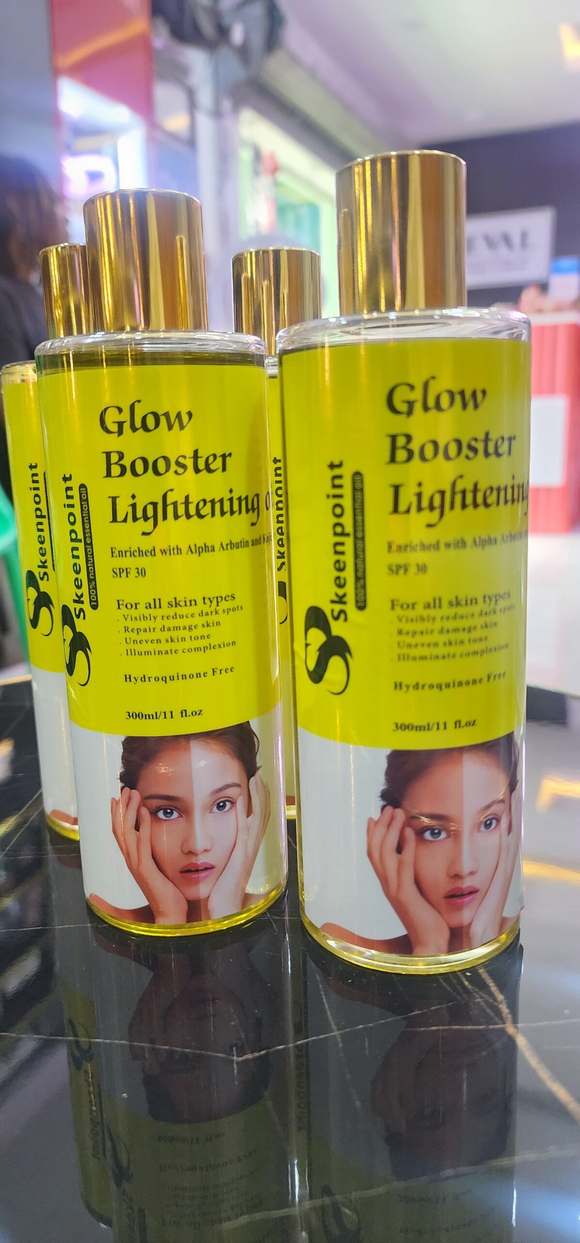 Skeenpoint Glow Booster Lightening Oil is a skin-brightening and complexion-enhancing oil enriched with Alpha Arbutin and Kojic Acid, combined with SPF 30 for sun protection. It is designed for all skin types and is hydroquinone-free. This formulation helps to visibly reduce dark spots, repair sun damage, and even skin tone while leaving the skin radiant.